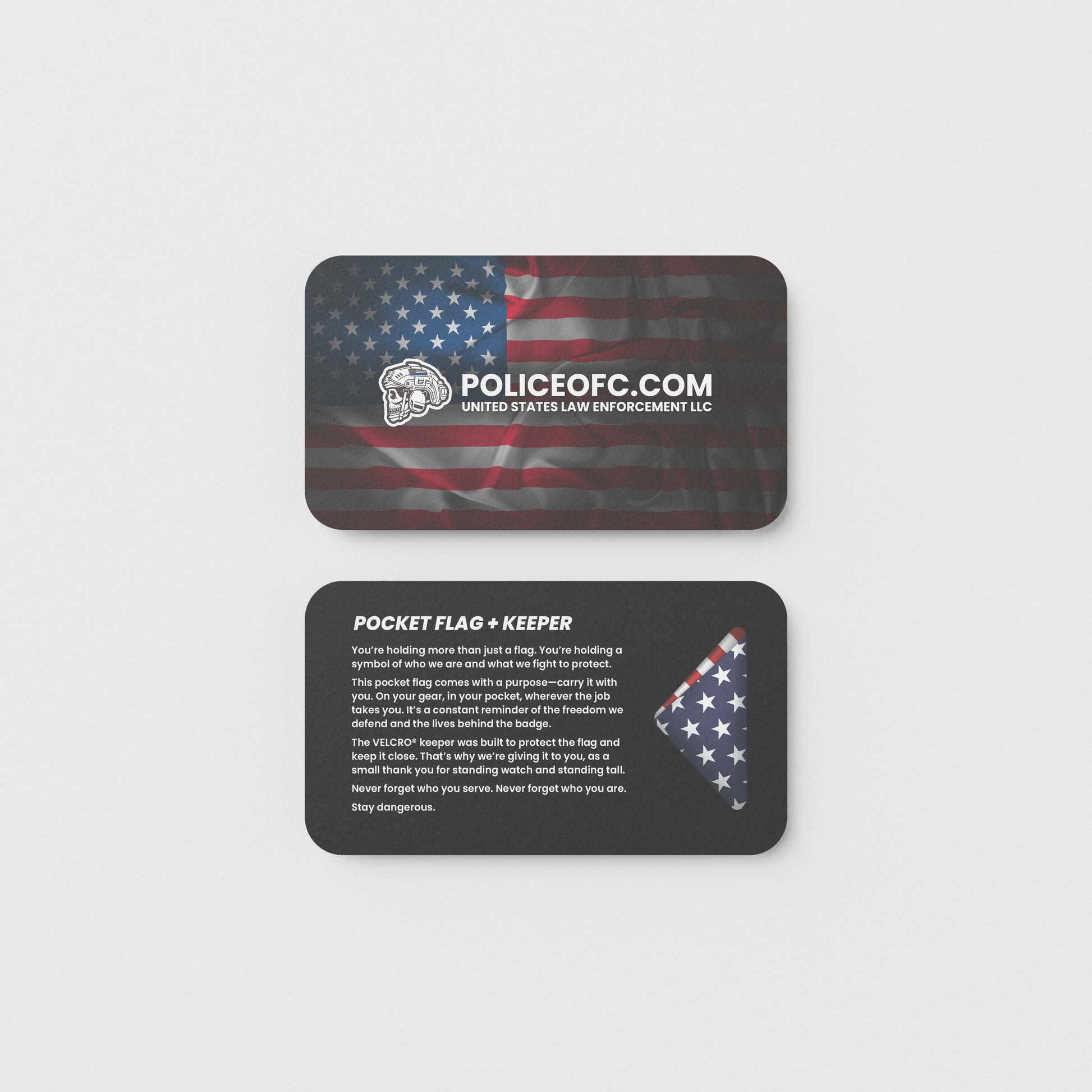 Each Pocket Flag Kit comes pre-packaged and ready to gift — whether to a first responder, a brother or sister in uniform, or to keep on your own gear. These aren’t throwaway tokens. The flag is USA-made cotton, the keeper is built from VELCRO® ONE-WRAP, and the card drives home the meaning behind it.